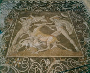 Στο κυρίως θέμα του ψηφιδωτού παρουσιάζονται δύο νεαροί κυνηγοί με τον σκύλο τους, τη στιγμή που έχουν πιάσει ένα ελάφι και ετοιμάζονται να το σκοτώσουν. Οι χλαμύδες τους ανεμίζουν, ενώ το καπέλο του ενός έχει φύγει από το κεφάλι του και είναι στην επάνω δεξιά πλευρά του έργου. Και οι δύο κυνηγοί έχουν υψωμένα τα όπλα τους (ο ένας το ξίφος και ο άλλος τον πέλεκυ), είναι γυμνοί, με σώμα γεμάτο σφρίγος, και σε στάση χαρακτηριστική της έντασης του κυνηγιού (ανοιχτά πόδια, υψωμένα χέρια κτλ.). Ο κυνηγός στα δεξιά κρατά το ελάφι από το κέρατο, τη στιγμή που ο αδύνατος και νευρώδης σκύλος μπήγει τα δόντια του στα πλευρά του ελαφιού. Ο κυνηγός στα αριστερά φέρει εκτός από τον πέλεκυ και ένα ξίφος στη θήκη του.