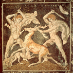 Οι πληροφορίες μπορεί να είναι ιστορικού και αρχαιολογικού ενδιαφέροντος, καθώς πρόκειται για το δάπεδο μιας συγκεκριμένης οικίας στην πρωτεύουσα της αρχαίας Μακεδονίας, Πέλλα. Η ίδια η εικόνα όμως μας πληροφορεί για τις συνήθειες των νέων εκείνης της εποχής. Το κυνήγι ήταν αγαπημένη απασχόληση των Μακεδόνων. Ήταν επίδειξη θάρρους, ήταν επιθυμία για δράση και περιπέτεια, ήταν προετοιμασία των νέων για τον πόλεμο. Βεβαίως το κυνήγι ήταν επίσης ανάγκη, αφού τα θηράματα αποτελούσαν βασικό κομμάτι της διατροφής των ανθρώπων. Οι κυνηγοί χρησιμοποιούσαν απλά όπλα (ρόπαλα κτλ.) και είχαν μαζί τους σκυλιά, που τους βοηθούσαν στην αναζήτηση και καταδίωξη των θηραμάτων τους. Εξάλλου, η λέξη «κυνηγός» σημαίνει αυτόν που καθοδηγεί (άγει) τα σκυλιά (κύνες). Το κυνήγι ως θέμα σε έργα τέχνης το συναντάμε συχνά εκείνη την εποχή. Απόκρυψη